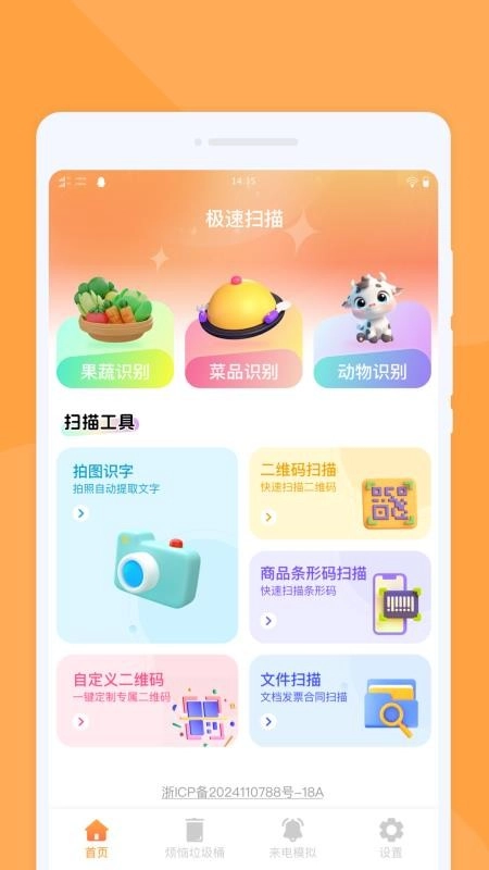 正晶极速扫描是一款功能强大且用途广泛的扫描识别工具,致力于为用户带来更丰富的识别体验。无论是日常所见的瓜果蔬菜、各类动物,还是需要处理的文件文字、图片内容,乃至商品的条形码,都能通过应用一键快速扫描,并精准获取识别结果。这不仅能让你更便捷地了解各类物体的相关信息,还能高效提取所需文字,方便复制使用,助力工作轻松开展。 正晶极速扫描的最新版本还贴心配备了虚拟来电和烦恼垃圾箱功能。在应用内,你可以根据需求自定义虚拟来电的号码与时间等信息,届时就能借助来电提醒,自然地接听并“逃离”当前场景;同时,你也能自由写下心中的烦恼并投入垃圾箱,清空困扰自己的问题,尽情享受惬意美好的生活。
