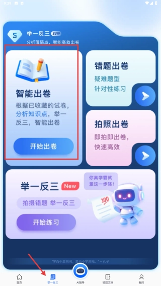 2、点击举一反三页面,有智能出卷选项,可以进入科目选择页面。