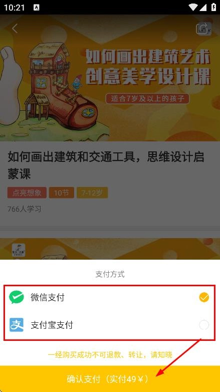 4、在支付方式选择页面,选好支付方式后,点击确认支付,完成课程购买。