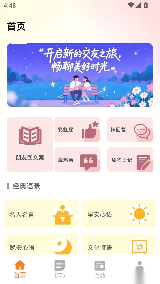 交友神器手机版是一款集恋爱方法教学、经验技巧、话术知识、星座配对辅助功能于一体的应用软件。它能为单身用户提供大量交友技巧,汇集了超多精选聊天话术与开场白教学资源,让大家随时在线学习高质量聊天文案、毒鸡汤、神级回复、土味情话等内容,掌握实用的恋爱经验与技巧;此外,软件还包含丰富的交友游戏资源,大转盘、猜歌挑战、真心话大冒险、摇骰子等娱乐玩法应有尽有。对这款软件感兴趣的朋友,千万别错过,赶紧来本站体验吧!