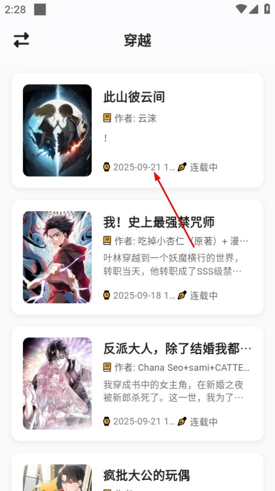 2、在漫画分类页面,点击穿越分类,查看穿越类漫画。