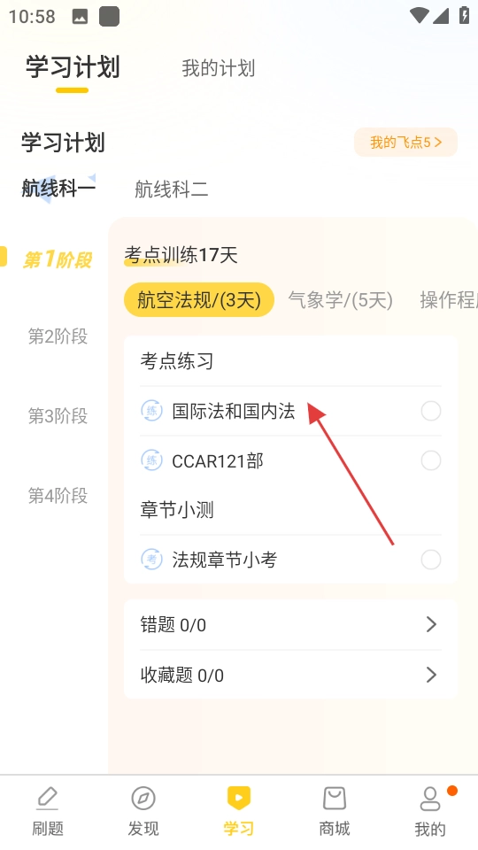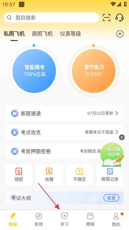 1、在飞行之翼首页,点击底部的学习,进入学习计划页面。