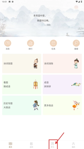 1、打开文化学习类,点击底部学习选项,进入学习页面。