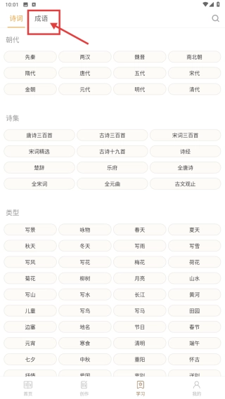 2、在学习页面,点击成语选项,进入成语分类列表。