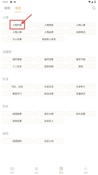 3、在成语分类列表中,点击人物外貌选项,展开人物外貌细分分类。