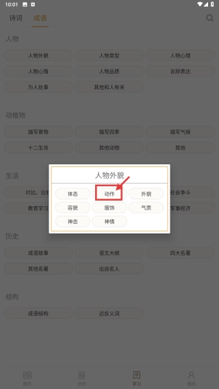 4、在细分分类中,点击动作选项,查看与人物动作相关的成语内容。