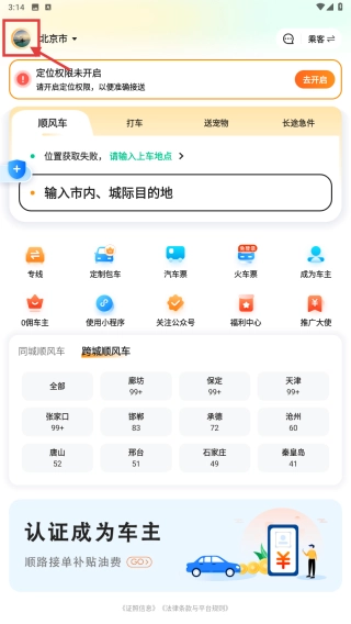1、打开出行类,点击左上角个人头像,进入个人中心页面。