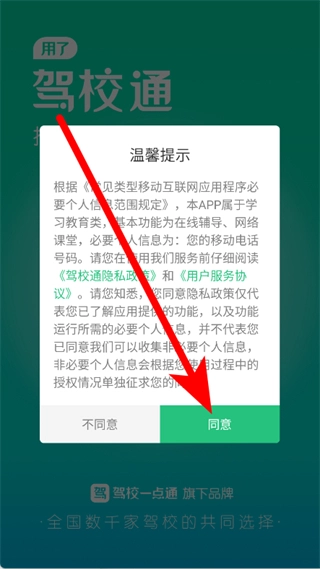1、打开驾校通,在弹出的温馨提示弹窗里点击同意,进入主界面。