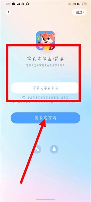 3、在手机号登录注册页面,输入手机号,点击获取验证码按钮。
