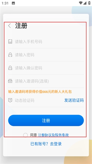 3、在注册页面,输入信息,同意协议后点击注册,完成注册即可登录。