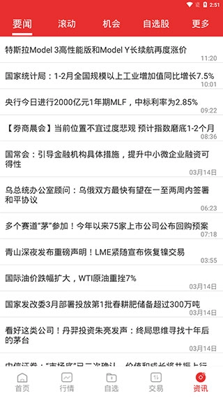 5、【资讯】页面向用户呈现的均为证券领域的新闻内容,这些内容还被细化划分为要闻、滚动、机会、自选股等不同板块。
