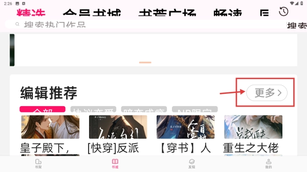 1、打开小说阅读类应用,点击编辑推荐旁的更多按钮,进入编辑推荐小说列表页。