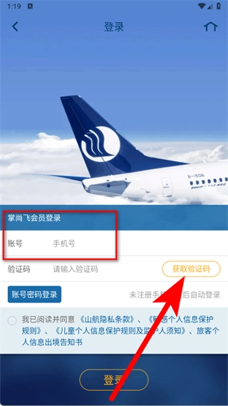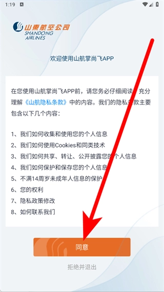 1、打开山航掌尚飞,仔细阅读条款后,点击同意按钮。