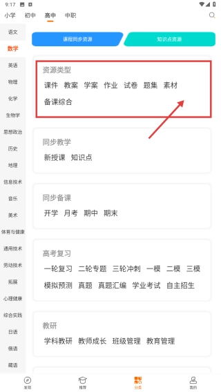 2、在资源分类页面,选择数学学科,进入数学资源列表页。