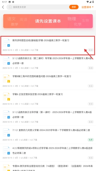 4、在资源列表中,点击目标教学资源如数列和题型总结学案,查看资源详情。