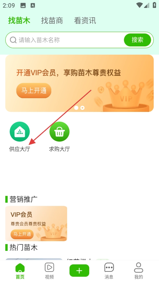 2、在软件首页,点击【供应大厅】,进入苗木供应列表页面。