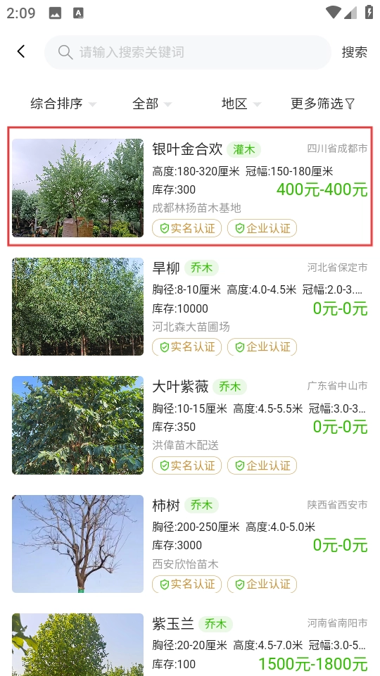 3、在苗木供应列表中,选择【银叶金合欢】苗木,进入其详情页。