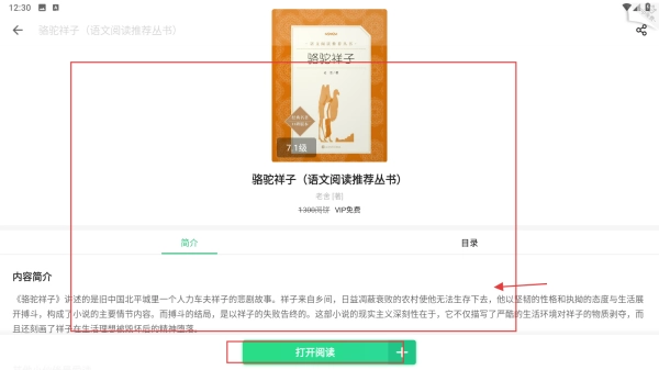 3、点书籍(如《骆驼祥子》),进详情页看简介、目录,点【打开阅读】。