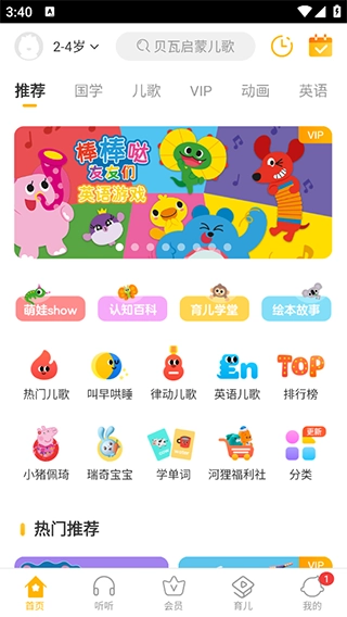 贝瓦儿歌是一款面向小朋友打造的儿歌娱乐应用,针对三岁、五岁等不同年龄段的孩子都有专属的儿歌音乐欣赏板块,能助力0-8岁小朋友在成长阶段认识世界、培养良好的生活习惯。平台上有丰富的音乐短剧,小朋友可以通过观看这些短剧学习好习惯,获得成长助力;同时还提供了超过14000部内容,涵盖经典儿歌、英文启蒙、热门精品动画、诗词国学、成语故事、睡前故事、儿童绘本等原创及优质引进资源,欢迎大家前来体验~