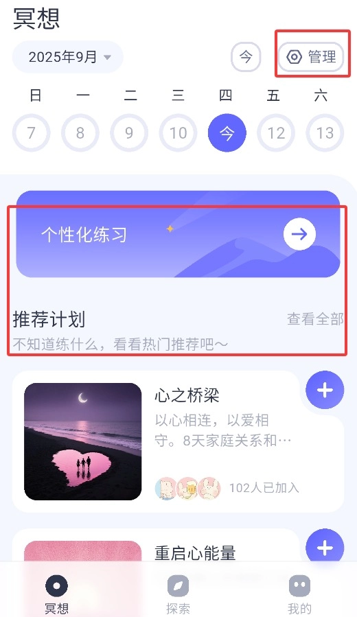 2、在冥想板块,可点击右上角管理个性化练习计划或使用推荐课程。