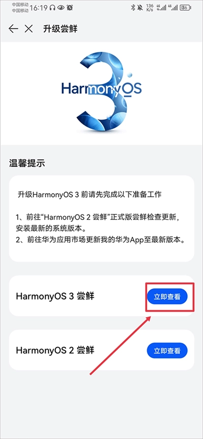 2、进入后点击HarmonyOS 3尝鲜右边的立即查看;