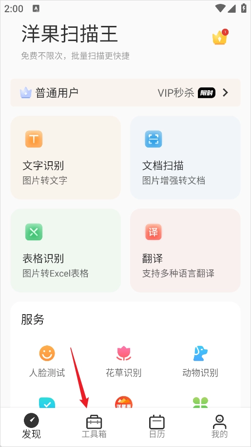 1、回到首页底部功能区,点击【工具箱】。