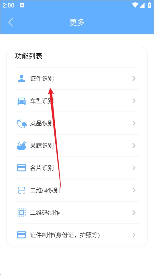 2、在展开的菜单中找到并选择【证件识别】。