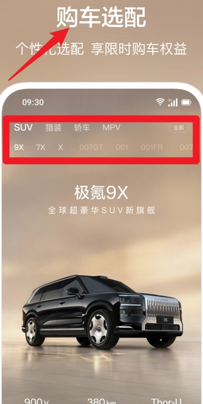 2、在购车选配环节,您可以浏览SUV、新车、MPV等不同类型的车型,挑选出适合自己的车型,同时还能享受相应的购车权益。