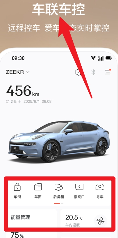 3、点击车联车控功能,能够对车辆进行远程操控,具体涵盖车锁、车窗、慢充口的控制以及寻车操作,此外还可以查看能量管理情况和车内温度信息。