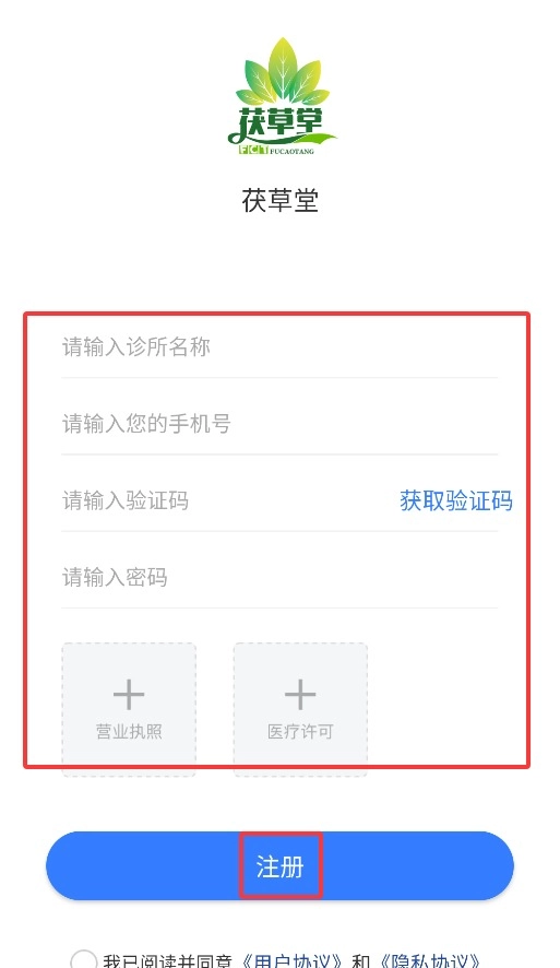 3、通过填写诊所名称、手机号、验证码、密码并上传营业执照及医疗许可证完成注册。
