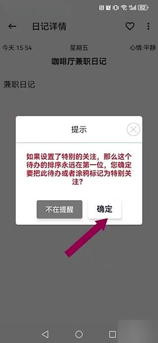 3、界面弹出操作确认提示框,选择确认选项完成收藏设置。此时该日记将被添加至收藏分类,便于日后快速查找重要记录。