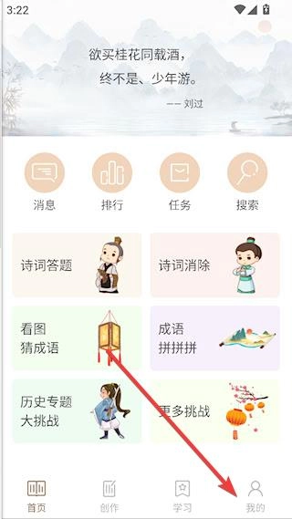 1、打开诗词天地,进入诗词天地首页,点击右下角【我的】