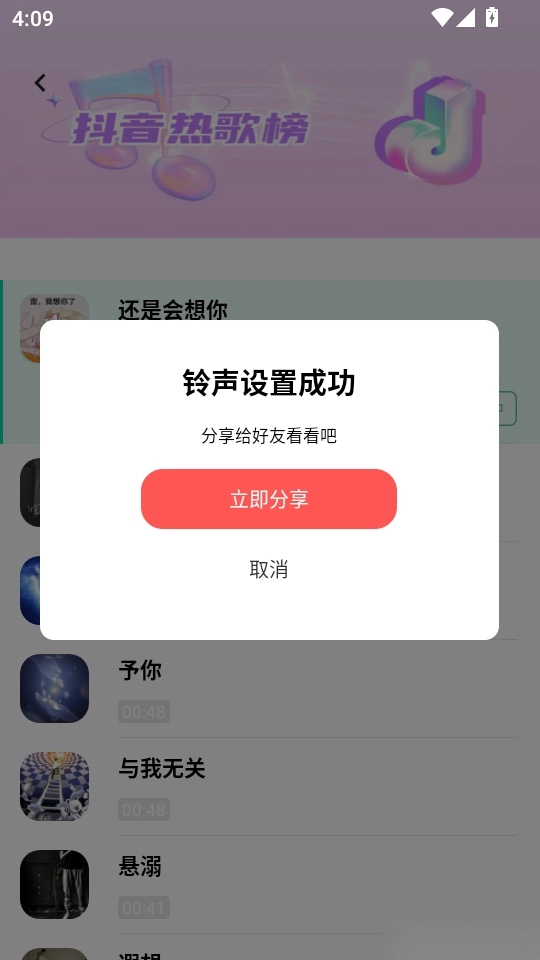 6. 最终会弹出“铃声设置成功”的提示窗口,此时可点击“立即分享”按钮将其分享给好友。