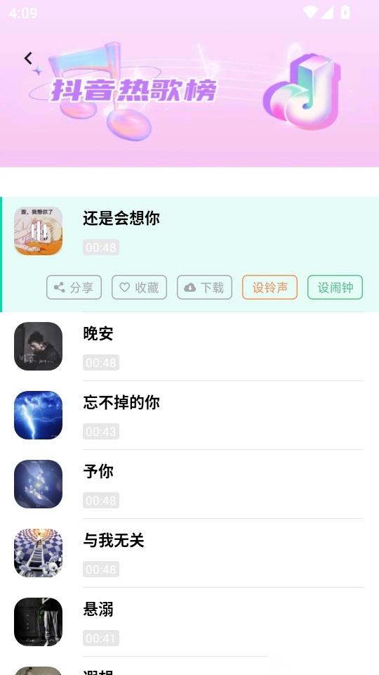 4. 接着挑选自己喜爱的抖音热门歌曲,之后点击“设铃声”功能按钮,进入到下一步操作。