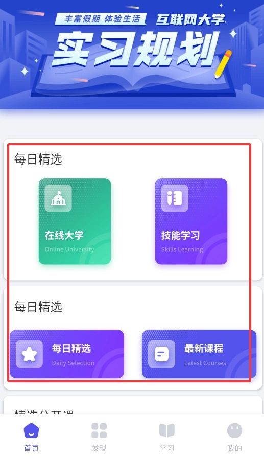 2、首页提供每日精选课程、在线大学及技能学习等多样化教育资源入口。