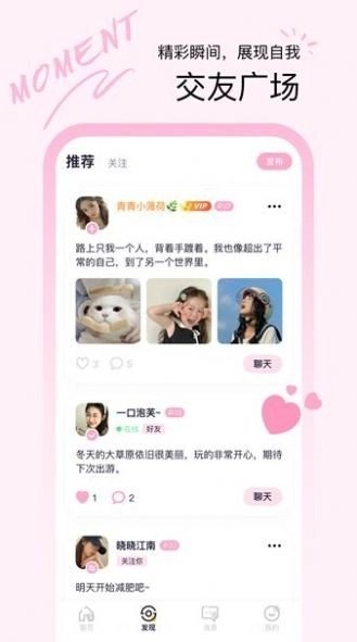 可以随时随地上传自己的动态,分享生活里的开心事和烦心事,和喜欢的TA一起秀恩爱,通过互动认识朋友,让TA对你动心!也能悄悄关注TA的动态,知道TA喜欢什么,然后给TA准备特别的惊喜。