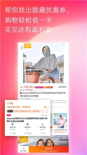 高返优惠券软件可对淘宝、天猫、京东、拼多多等主流购物网站的商品及优惠券进行搜索。用户不仅能快速查找所需商品与优惠券,还能获取商品的详细信息、用户评价和销量数据等内容,助力用户更便捷地做出购物选择。