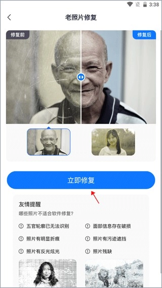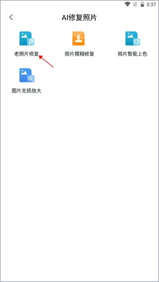 2. 依据照片的受损情况挑选对应的功能,点击“老照片修复”选项。