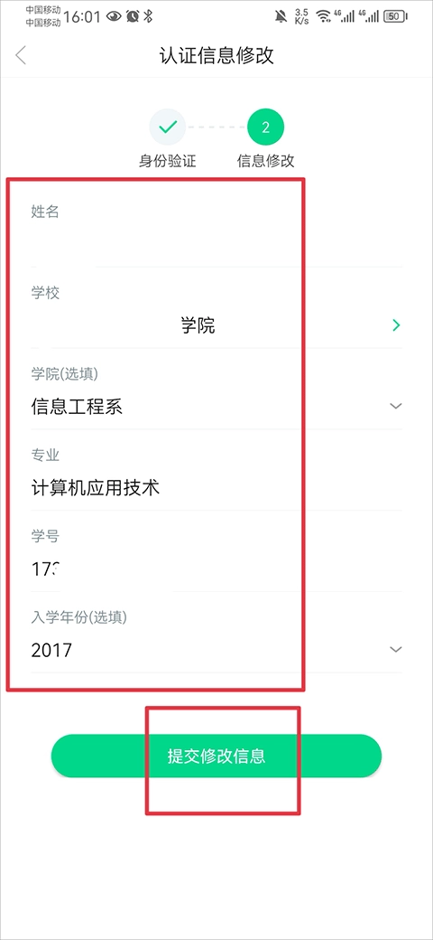 4、最后将正确的学校名称、学号等信息完善后点击提交修改信息即可
