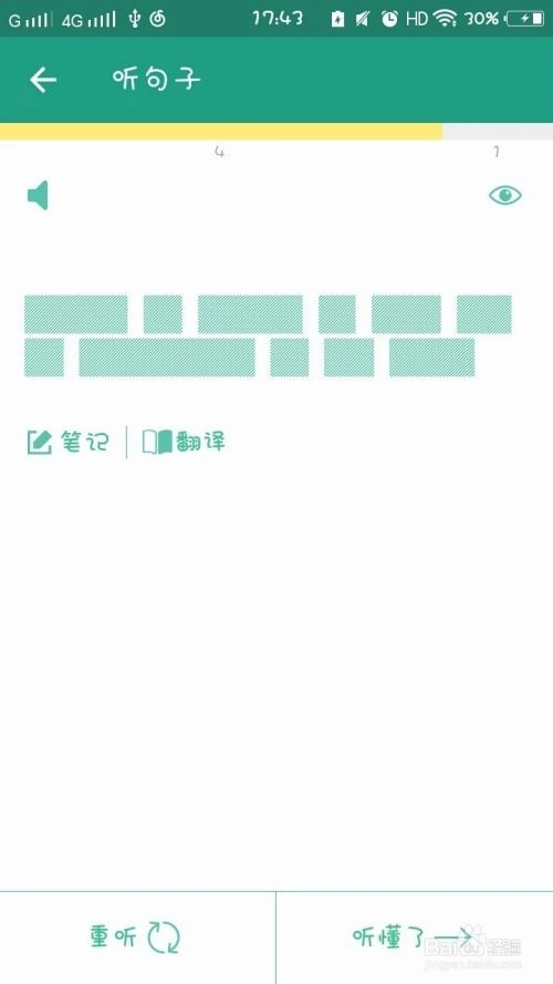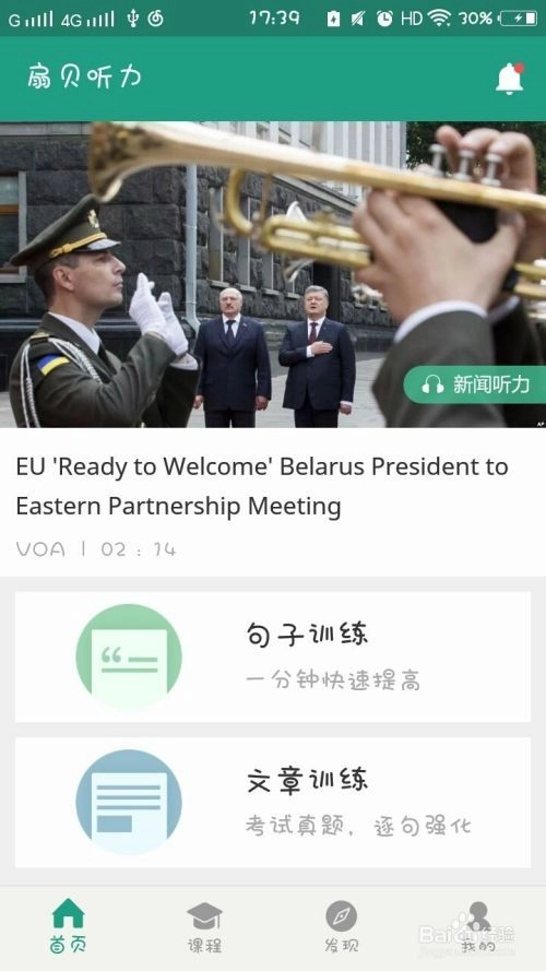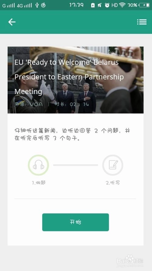 打开软件后映入眼帘的是首页面,这里有一篇新闻听力内容。点击进入后,系统会引导你边听边回答问题,听完还需要写下3个句子。只需点击“开始”按钮就能收听,听的时候可得专注一些。