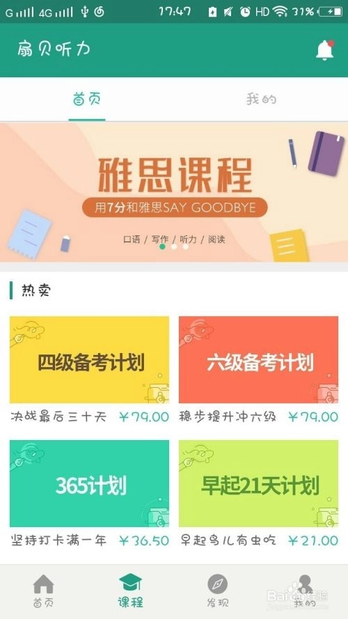 软件下方的“课程”分类里有各类课程,比如雅思、托福以及四六级考试等,你可以根据自身需求选择,这些课程是收费的。部分课程可用贝壳购买,贝壳既可以自行充值获取,也能通过每日打卡得到。