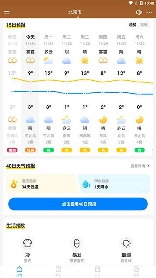 4、用户点击右下角的趋势按钮,即可查看未来15天的天气趋势变化。