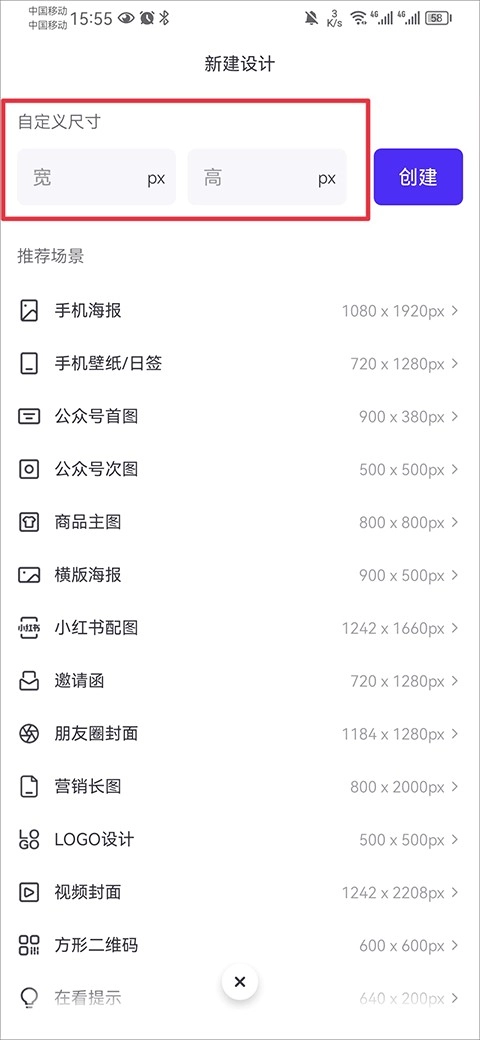 4、接着输入图片的宽和高,当然你也可以选择推荐场景中的尺寸。
