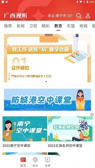 1、打开广西视听,在首页的分类栏中找到“教育”板块。