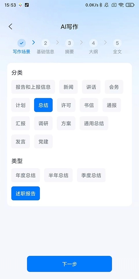 2、挑选写作类别,比如报告、总结、新闻、讲话等,再选定具体类型,像年度/季度/月度总结、述职报告这类,然后点击下一步;