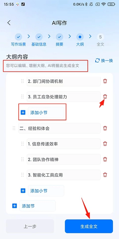 5、编辑、增删大纲,AI将据此生成全文;