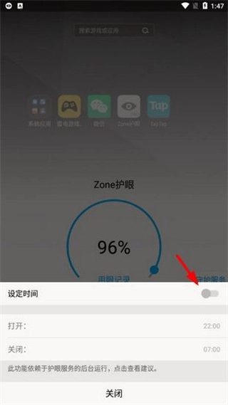 3、进入后,你可以手动设置运行时间,只要在你设定的时间段内,手机就会自动开启护眼模式。