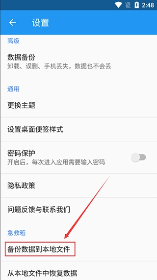 2、进入设置页面后,找到【急救箱】选项,再从中选择【备份数据到本地文件】功能。