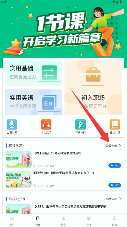 2、英语专项提升快:进入英语专区选取匹配自身水平的课程,根据系统规划完成每日学习内容。