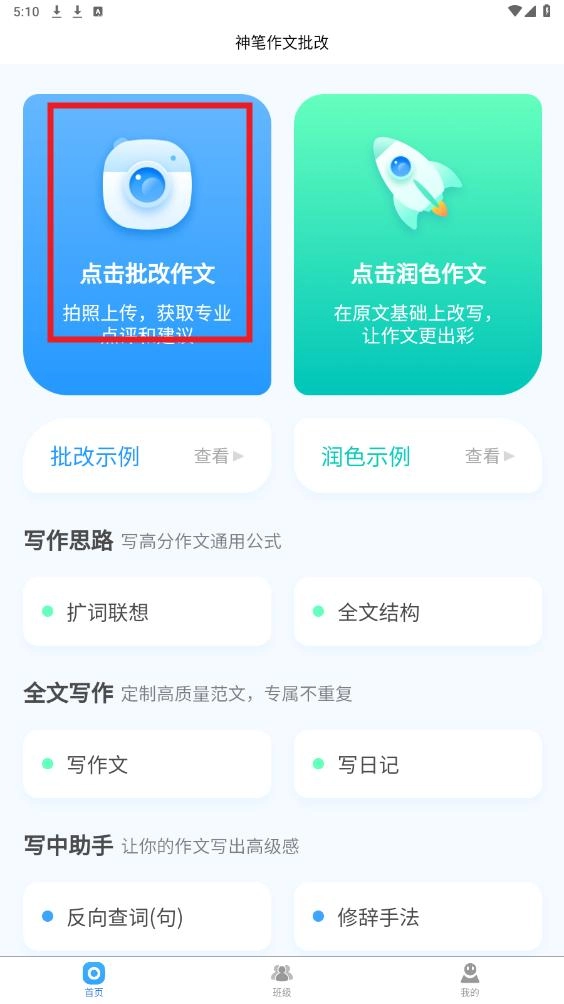 打开神笔作文批改,点击首页批改作文
